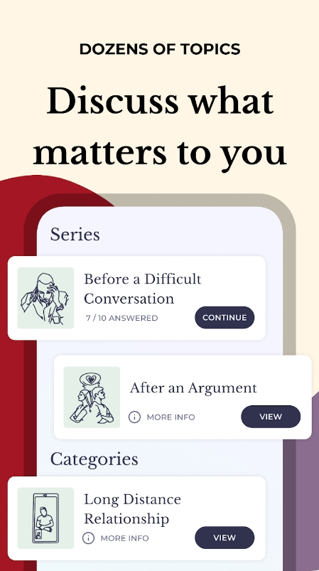 Whether you’re into topics like intimacy and sex, or just want to reminisce about shared history, this app has smth for everyone. And with such a wide scope of subjects to pick from, you’re sure to find new things to talk about with your spouse no matter how long you’ve been together. The UI is pretty simple, so no worries here.