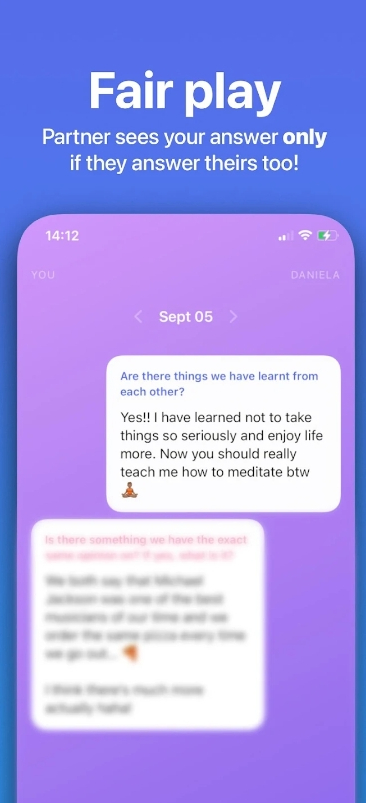 The concept of this one is pretty unique. Each day you get a personalized question based on your prefs, so you don’t need to worry about getting irrelevant ones. And the best bit, you can only see your spouse’s response once you reply to the query yourself.