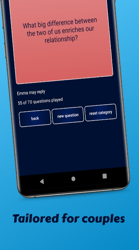 And finally, you guess each other’s answers! Trying to guess your partner’s answer can be an absolute blast, not to mention, an excellent way to discover new things about each other! Herewith, you can easily play at your own pace. You can save your progress and play together in real life, then resume the game anytime you want!
